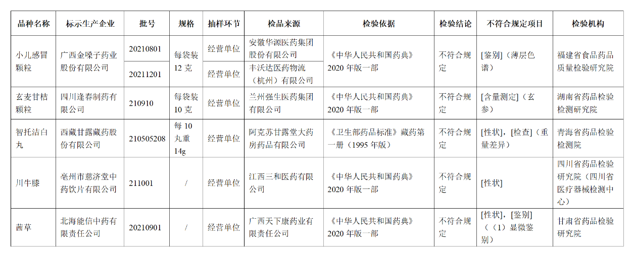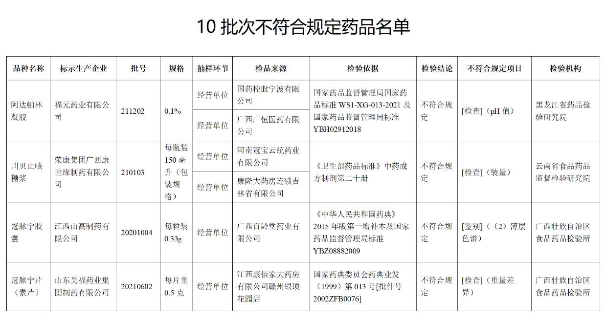 這些藥品包括:標示為廣西金嗓子藥業(yè)股份有限公司生產(chǎn)的2批次小兒感冒顆粒不符合規(guī)定,不符合規(guī)定項目為鑒別;標示為福元藥業(yè)有限公司生產(chǎn)的1批次阿達帕林凝膠不符合規(guī)定,不符合規(guī)定項目為pH值;標示為榮康集團廣西康世緣制藥有限公司生產(chǎn)的1批次川貝止咳糖漿不符合規(guī)定,不符合規(guī)定項目為裝量等。