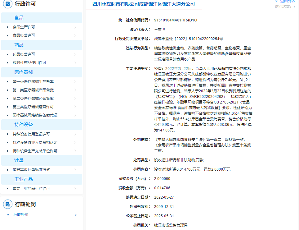 處罰決定文書顯示,經(jīng)查,2022年2月22日,當(dāng)事人四川永輝超市有限公司成都錦江區(qū)錦江大道分公司從成都凱博農(nóng)業(yè)發(fā)展有限公司購進(jìn)57公斤食用農(nóng)產(chǎn)品砂糖桔,購進(jìn)價格為每公斤7.40元。當(dāng)事人銷售的砂糖桔經(jīng)抽樣檢驗,苯醚甲環(huán)唑項目不符合GB 2763-2021《食品安全國家標(biāo)準(zhǔn) 食品中農(nóng)藥最大殘留限量》要求,檢驗結(jié)論為不合格。據(jù)調(diào)查,該抽檢不合格批次砂糖桔除1.6公斤售賣抽樣單位外,剩余55.4公斤已全部售賣消費者,銷售價格為每公斤9.98元。經(jīng)計算,本案貨值金額為568.86元,違法所得為147.06元。