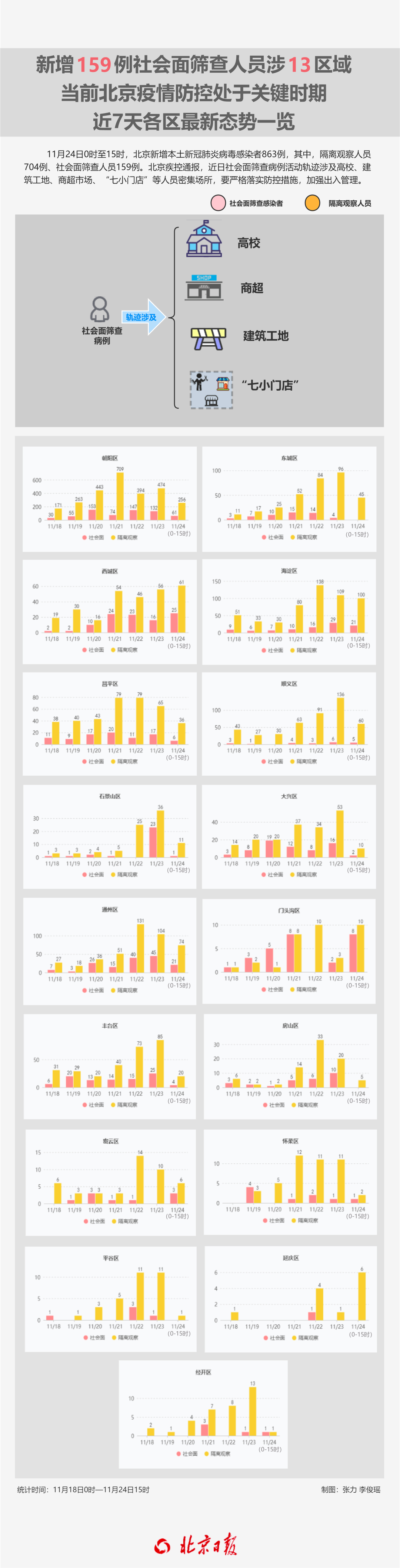 11月24日0時至15時,北京新增本土新冠肺炎病毒感染者863例,其中,隔離觀察人員704例、社會面篩查人員159例;朝陽區(qū)317例,海淀區(qū)121例,通州區(qū)95例,西城區(qū)86例,順義區(qū)65例,東城區(qū)45例,昌平區(qū)42例,豐臺區(qū)24例,門頭溝區(qū)18例,石景山區(qū)、大興區(qū)各12例,密云區(qū)9例,延慶區(qū)6例,房山區(qū)5例,懷柔區(qū)3例,經(jīng)開區(qū)2例,平谷區(qū)1例;重型3例、普通型2例、輕型164例、無癥狀感染者694例。