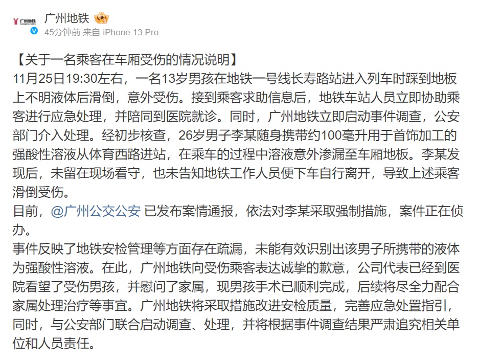 廣州地鐵方面表示,事件反映了地鐵安檢管理等方面存在疏漏,未能有效識別出該男子所攜帶的液體為強(qiáng)酸性溶液,向受傷乘客表達(dá)誠摯的歉意。廣州地鐵公司代表已經(jīng)到醫(yī)院看望了受傷男孩,并慰問了家屬,現(xiàn)男孩手術(shù)已順利完成,后續(xù)將盡全力配合家屬處理治療等事宜。