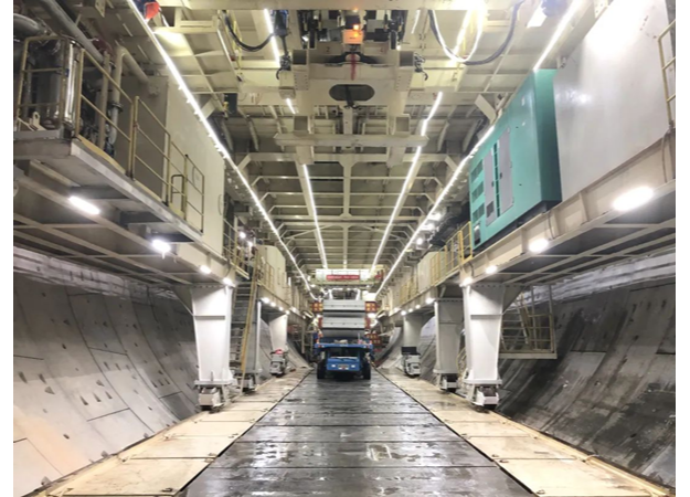 珠海興業(yè)快線隧道工程現(xiàn)場,一臺(tái)重4500噸、超5層樓高的“地下航母”正奮勇掘進(jìn),管片一片一片拼裝,隧道隨之一米一米建成。這臺(tái)“地下航母”,就是由中交天和自主研制的中國首臺(tái)超大直徑同步掘進(jìn)機(jī)“興業(yè)號(hào)”,這也是國內(nèi)首次采用的同步掘進(jìn)設(shè)計(jì)。常規(guī)隧道掘進(jìn)機(jī)拼裝管片,一環(huán)管片寬2米,刀頭油缸推動(dòng),而油缸推動(dòng)距離僅為2米多。因而,掘進(jìn)2米后必須停止,掘進(jìn)一環(huán)耗時(shí)近60分鐘,拼裝管片一環(huán)耗時(shí)近45分鐘。“興業(yè)號(hào)”的關(guān)鍵在于同步掘進(jìn),它改變了傳統(tǒng)油缸設(shè)計(jì),推動(dòng)距離可延長至4米,刀頭可實(shí)現(xiàn)持續(xù)掘進(jìn),后方同時(shí)拼裝管片,施工速度較國內(nèi)外同類掘進(jìn)機(jī)提升25-35%,對超大直徑盾構(gòu)機(jī)發(fā)展具有一定劃時(shí)代意義。