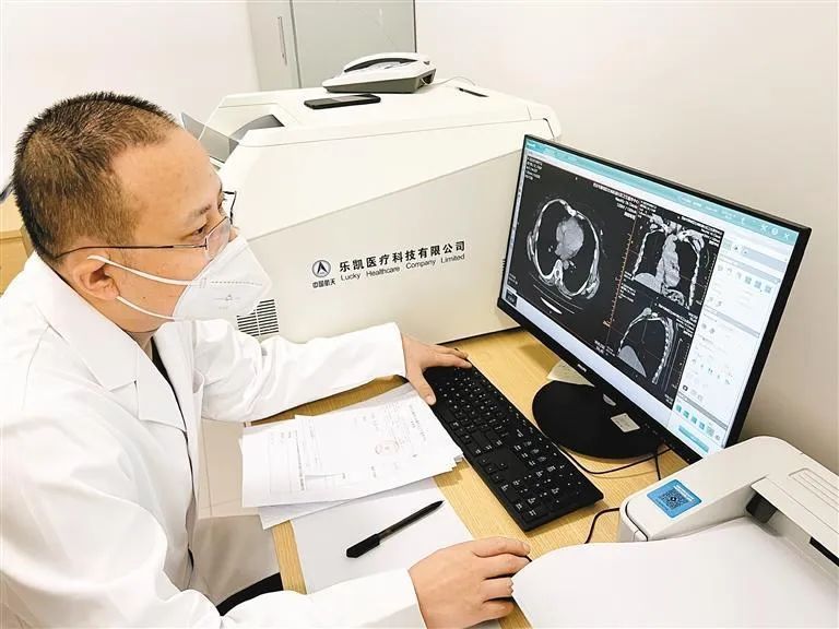 10日上午,在杜城社區(qū)衛(wèi)生服務(wù)中心診室門前,等候拍片的患者不多。在工作人員引導(dǎo)下,大家有序進入拍攝區(qū)。診室內(nèi),陜西省康復(fù)醫(yī)院影像一科主任高雅鵬正在一個看似與普通顯示器沒什么兩樣的電腦前書寫診斷報告。“比起一般的CT靜態(tài)閱片,在這臺顯示器的幫助下,我們可以實現(xiàn)多角度、多方位、動態(tài)式閱片,讓診斷更加細致精準?!?高雅鵬說,這臺CT機的配置完全可以滿足周邊居民對于肺部CT的拍片需求。