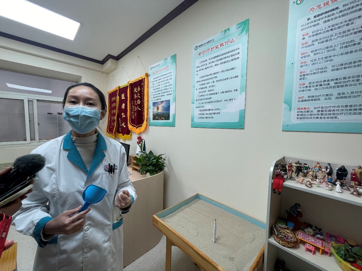 蒲黃榆社區(qū)衛(wèi)生服務中心安寧療護社工向記者介紹心理沙盤