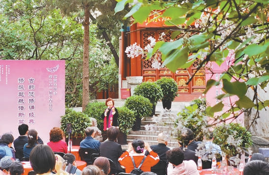 在10日的丁香詩會上,朗誦藝術(shù)家為觀眾帶來詩詞朗誦表演。本報記者 方非攝