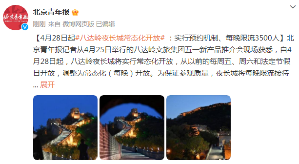 4月28日起八達(dá)嶺夜長城常態(tài)化開放:實(shí)行預(yù)約機(jī)制、每晚限流3500人