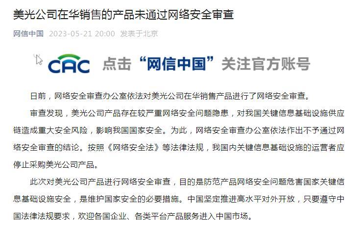 審查發(fā)現(xiàn),美光公司產(chǎn)品存在較嚴重網(wǎng)絡安全問題隱患,對我國關鍵信息基礎設施供應鏈造成重大安全風險,影響我國國家安全。為此,網(wǎng)絡安全審查辦公室依法作出不予通過網(wǎng)絡安全審查的結論。按照《網(wǎng)絡安全法》等法律法規(guī),我國內(nèi)關鍵信息基礎設施的運營者應停止采購美光公司產(chǎn)品。