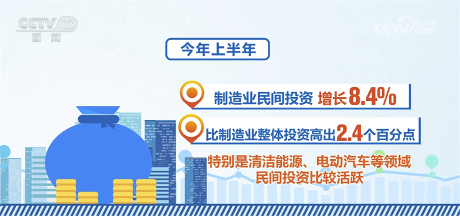 國家發(fā)展改革委相關(guān)負責人表示,當前,民間投資結(jié)構(gòu)持續(xù)優(yōu)化,一些領(lǐng)域民間投資顯現(xiàn)了不少亮點。今年上半年,除房地產(chǎn)開發(fā)以外的民間投資同比增長9.4%,增速比全部投資高5.6個百分點;制造業(yè)民間投資增長8.4%,比制造業(yè)整體投資高出2.4個百分點,特別是清潔能源、電動汽車等領(lǐng)域民間投資比較活躍;基礎(chǔ)設施民間投資增長15.6%,比基礎(chǔ)設施整體投資高出8.4個百分點,呈現(xiàn)出較強的投資信心和投資動力。