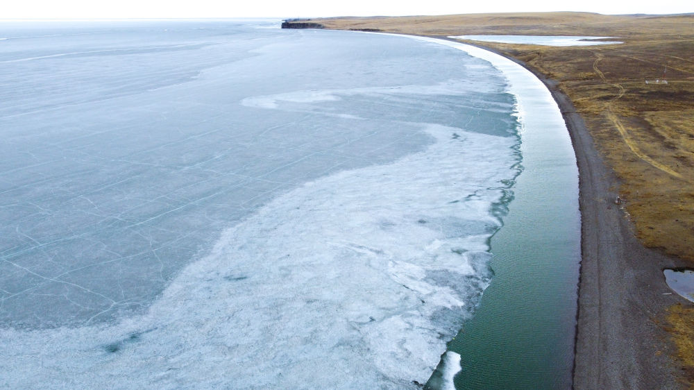 這是4月17日拍攝的呼倫湖開(kāi)湖景象(無(wú)人機(jī)照片)。新華社記者 王楷焱 攝