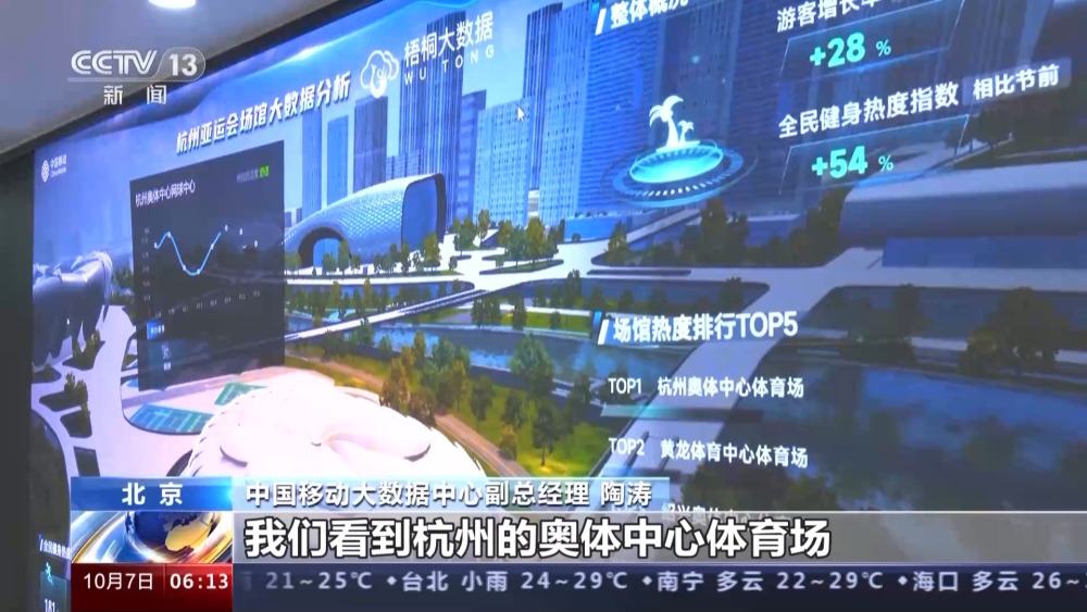 中國移動(dòng)大數(shù)據(jù)中心副總經(jīng)理 陶濤:前往亞運(yùn)會(huì)主要舉辦城市的游客的數(shù)量相比節(jié)前一周日均增幅超過28%,主要是來自長三角地區(qū)以及津京冀等地區(qū)。根據(jù)我們對(duì)于線上訂票以及搜索這些數(shù)據(jù)的分析,我們看到杭州的奧體中心體育場、黃龍?bào)w育中心體育場以及紹興奧體中心體育館這三個(gè)場館是最熱的體育場館。