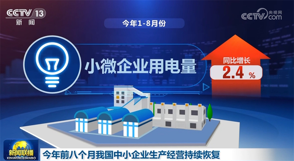 最新數(shù)據(jù)顯示,今年1—8月份,小微企業(yè)用電量同比增長2.4%。其中,“小巨人”企業(yè)、專精特新中小企業(yè)用電量同比分別增長12.7%、9.6%。隨著一系列穩(wěn)增長政策措施集中發(fā)力,8月份,中小企業(yè)信心指數(shù)達(dá)61.9%,采購指數(shù)50.6%,分別較7月份上升0.7個(gè)百分點(diǎn)、0.3個(gè)百分點(diǎn)。