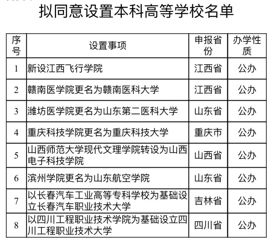 教育部擬同意設(shè)置8所高校
