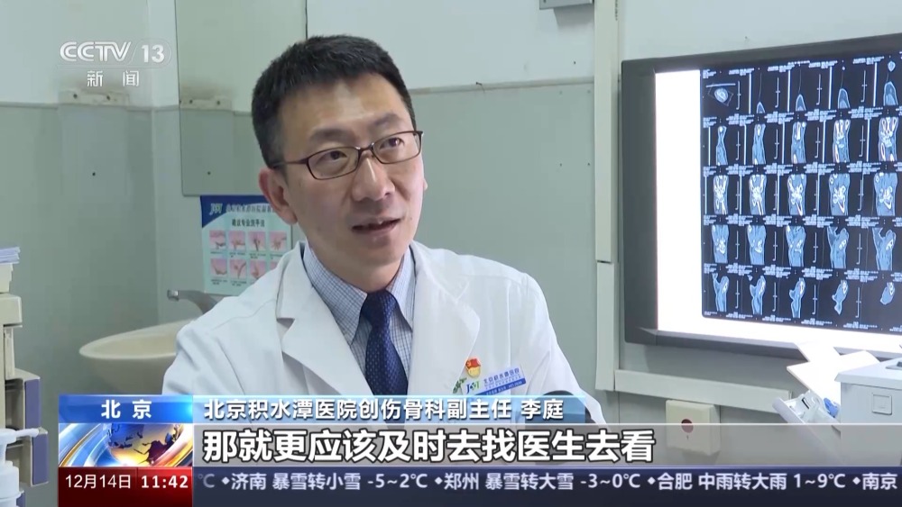 北京積水潭醫(yī)院創(chuàng)傷骨科副主任 李庭:下雪之后往往是以滑倒摔傷這種造成的損傷為主,我們第一位的就是橈骨遠端骨折,需要打石膏的,就已經(jīng)錯位了。