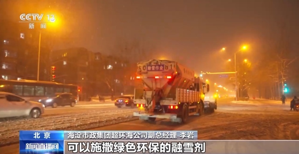 海淀市政集團(tuán)超環(huán)海公司副總經(jīng)理 李巖:通過(guò)人機(jī)配合的工作模式,縮短道路恢復(fù)的時(shí)間。大型的機(jī)械設(shè)備,主要是多功能除雪車,前面有滾刷,可以將雪打碎,后面有撒布設(shè)備,可以施撒綠色環(huán)保的融雪劑。