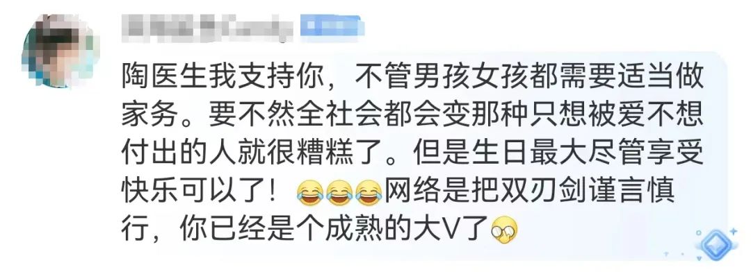 一部分網(wǎng)友認(rèn)為表達(dá)了對陶勇醫(yī)生的支持:“不管男孩女孩都需要適當(dāng)做家務(wù)”“玉不琢不成器”。