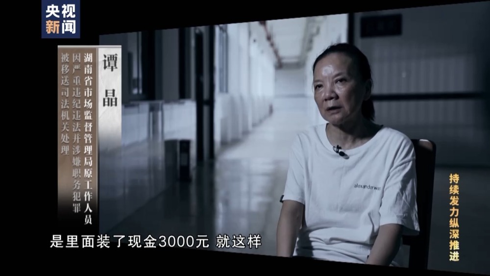 湖南省市場監(jiān)督管理局原工作人員 譚晶:他就拿了一個(gè)信封,在沒人的地方他就悄悄塞給我,他說是我們單位的資料。然后我回去以后發(fā)現(xiàn)是里面裝了現(xiàn)金3000元,就這樣。所以我不逃避我自己的(責(zé)任),犯了法要承擔(dān)法律的責(zé)任,一定要。