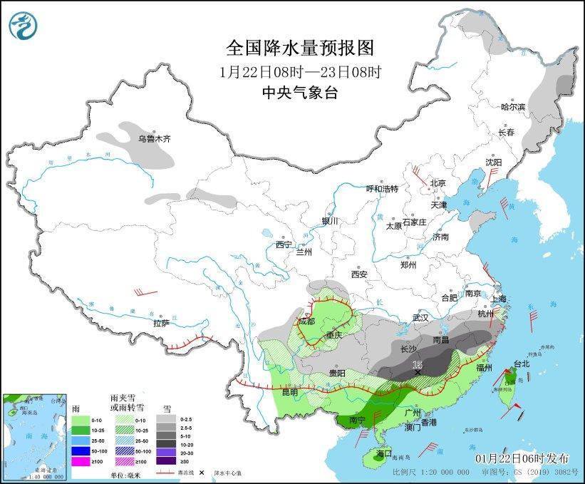 1月22日08時至23日08時,黑龍江東部和西北部、吉林東部、新疆中部、甘肅河西、川西高原西南部、四川盆地南部、陜西南部、重慶東部、云南東部、貴州、湖北西部、湖南南部、江西、安徽南部、浙江中南部、福建北部、廣東北部、廣西北部等地部分地區(qū)有小到中雪或雨夾雪,其中,湖南南部、江西中南部、浙江西南部、福建西北部、廣西東北部、廣東北部等地部分地區(qū)有大到暴雪(10~15毫米)。四川盆地中部、云南中部、廣西中南部、廣東中南部、福建中南部、海南島、臺灣島等地部分地區(qū)有小到中雨。遼東半島、河北北部、浙江北部、廣西東南部沿海等地部分地區(qū)有5~6級風,渤海、渤海海峽、黃海、東海、臺灣海峽、臺灣以東洋面、巴士海峽、南海大部、北部灣等海域有6~8級風,陣風9~10級(見圖3)。