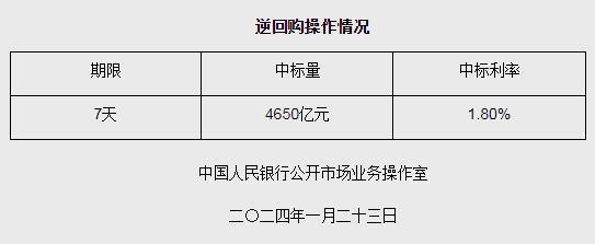 中新網(wǎng)1月23日電 據(jù)央行網(wǎng)站消息,為維護(hù)銀行體系流動(dòng)性合理充裕,2024年1月23日人民銀行以利率招標(biāo)方式開展了4650億元逆回購操作,中標(biāo)利率1.80%,期限為7天。具體情況如下: