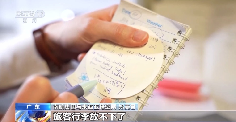 南航集團(tuán)馬來西亞籍空乘 鄭美君:有一位旅客坐在36排K,行李后面放不下了,我就給他移到前面,我又擔(dān)心自己會(huì)忘記,所以我一放下就直接把它記下來。
