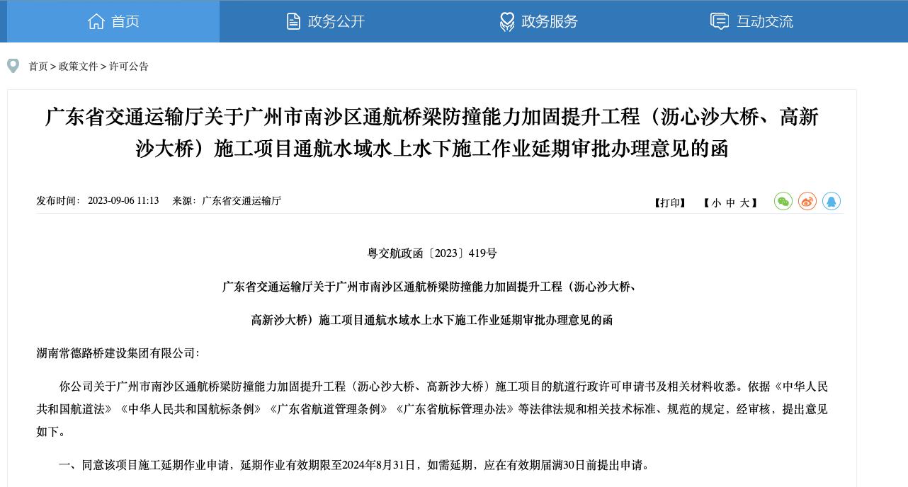 2023年9月,廣東省交通運(yùn)輸廳又發(fā)布瀝心沙大橋、高新沙大橋防撞加固工程延期審批意見(jiàn),文件中稱“同意該項(xiàng)目施工延期作業(yè)申請(qǐng),延期作業(yè)有效期限至2024年8月31日”。