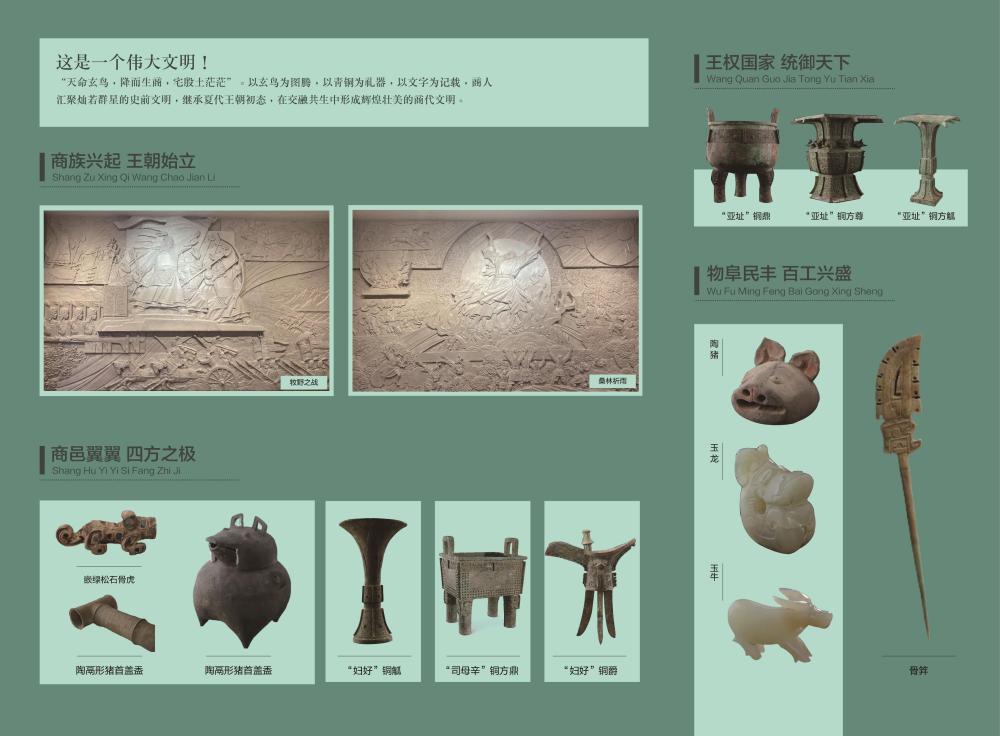 基本陳列將長(zhǎng)期對(duì)公眾開放,展示幾代殷墟考古人接力前行、不斷求索,取得了一次又一次重要發(fā)掘成果,對(duì)夏商都邑的深入研究,為不同時(shí)期不同區(qū)域的商文化研究提供了對(duì)比標(biāo)尺。眾多首次亮相的各類珍貴文物再現(xiàn)了商朝繁盛的城市文明,完善的禮樂(lè)文明、發(fā)達(dá)的青銅文明、燦爛的文字文明以及高超的科技文明。全面系統(tǒng)地展現(xiàn)了我國(guó)商代晚期都城的風(fēng)貌,讓全世界看到一個(gè)中華文明早期發(fā)展階段最為輝煌的時(shí)代——大邑商。