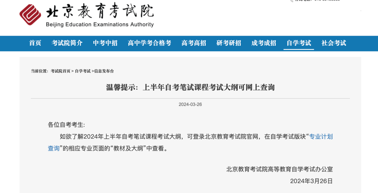 央廣網(wǎng)北京3月27日消息(記者 吳佳怡)據(jù)悉,2024年上半年自考筆試課程考試大綱可網(wǎng)上查詢??忌傻卿洷本┙逃荚囋汗倬W(wǎng),在自學(xué)考試版塊“專業(yè)計劃查詢”的相應(yīng)專業(yè)頁面的“教材及大綱”中查看。