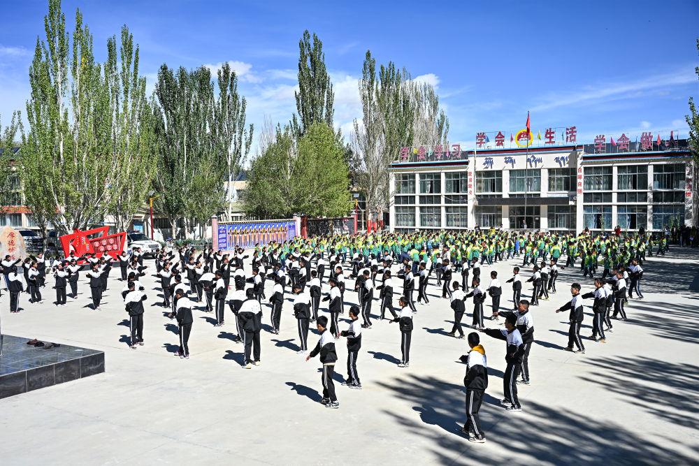 課間時(shí)分,孩子們跳起融入國(guó)家級(jí)非物質(zhì)文化遺產(chǎn)“宣舞”特色的課間操,各民族學(xué)生手拉著手,笑容如同高原陽光般燦爛。