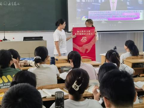 嶺南師范學(xué)院《教師語(yǔ)言》課程組負(fù)責(zé)人韓芳芳,兼任教育科學(xué)學(xué)院23小教6班班主任。她將課程教學(xué)與班級(jí)管理工作相結(jié)合,通過(guò)課程專(zhuān)業(yè)引領(lǐng)和支撐,組織學(xué)生參與全國(guó)第27屆普通話(huà)宣傳周,并攜手中秋佳節(jié),于9月13日晚舉辦了推普特色班會(huì),以生動(dòng)活潑的形式普及國(guó)家通用語(yǔ)言文字知識(shí),開(kāi)創(chuàng)新學(xué)期之新氣象。教科院黨委副書(shū)記陳理才應(yīng)邀參加了此次班會(huì)。