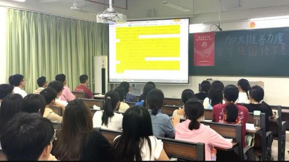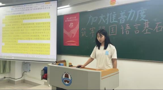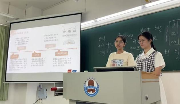 新學(xué)期伊始,《教師語(yǔ)言》課程教學(xué)團(tuán)隊(duì)將推普宣傳與課程的“音韻筑基”內(nèi)容相結(jié)合,理論層面講解我國(guó)通用語(yǔ)言文字的相關(guān)法律政策和普通話(huà)聲、韻、調(diào)等基礎(chǔ)知識(shí);實(shí)踐層面指導(dǎo)學(xué)生利用中國(guó)語(yǔ)言文字?jǐn)?shù)字博物館、師圈小程序等課程資源進(jìn)行學(xué)習(xí),邀請(qǐng)學(xué)生介紹普通話(huà)的發(fā)展歷程和我國(guó)第27屆推普宣傳主題中所滲透的“強(qiáng)國(guó)必須強(qiáng)語(yǔ),強(qiáng)語(yǔ)助力強(qiáng)國(guó)”價(jià)值內(nèi)涵。