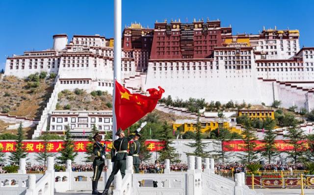10月1日,拉薩市布達(dá)拉宮廣場舉行升國旗儀式。 新華社記者 丁增尼達(dá) 攝