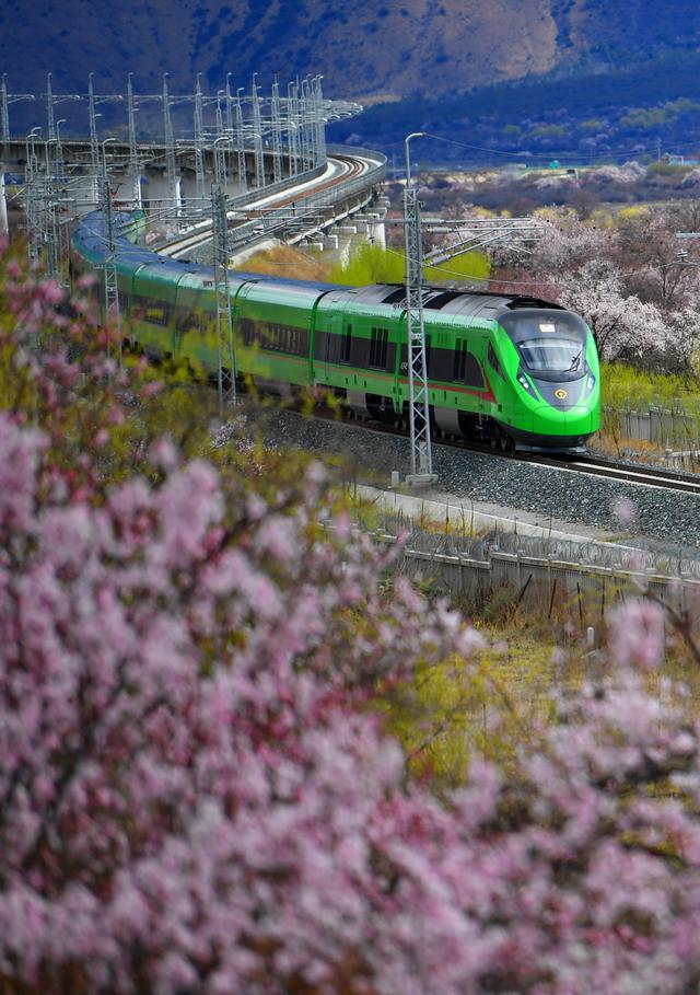 2023年3月21日,復(fù)興號列車穿行在西藏拉林鐵路林芝段的桃花間。新華社記者 覺果 攝