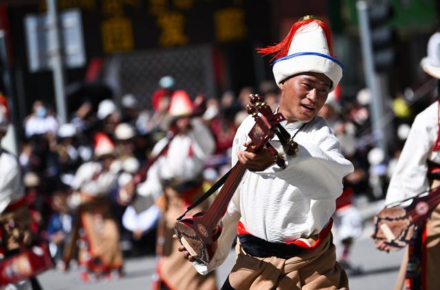 8月3日,在青海省果洛藏族自治州瑪沁縣,演員在慶祝果洛州成立70周年文藝展演活動(dòng)上表演。新華社記者 張龍 攝