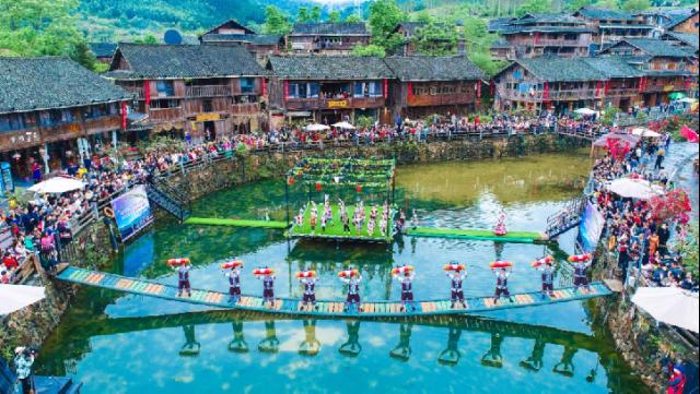 廣西投入中央財(cái)政少數(shù)民族發(fā)展資金1.6億元,打造民族村寨與鄉(xiāng)村旅游融合發(fā)展試點(diǎn)39個(gè)。圖為2024年4月廣西傳統(tǒng)民族節(jié)日“三月三”期間,來自全國的游客與夢嗚苗寨村民一起慶祝節(jié)日。廣西壯族自治區(qū)柳州市民宗委供圖