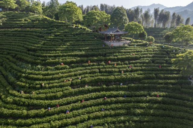 浙江省景寧畬族自治縣以國家民委“共同現(xiàn)代化試點(diǎn)”為抓手,積極促進(jìn)農(nóng)文旅融合發(fā)展。圖為2021年4月30日,參賽隊(duì)員在景寧縣澄照鄉(xiāng)三石村惠明茶園參加采茶比賽(無人機(jī)照片)。新華社發(fā)(李肅人 攝)