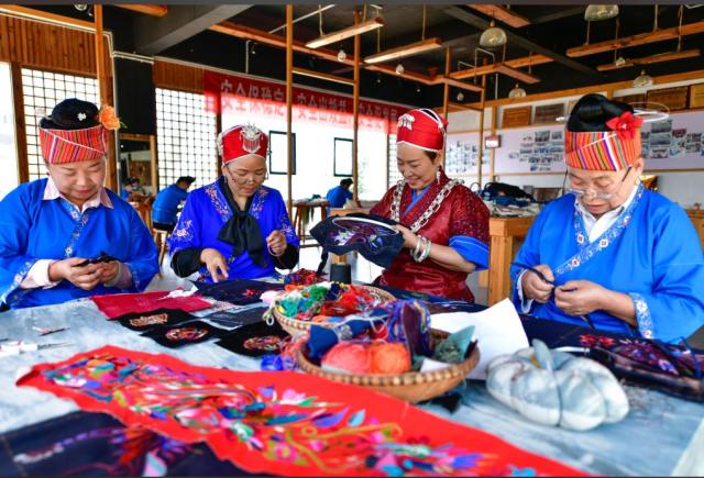 貴州省級非遺苗繡代表性傳承人龍祿穎創(chuàng)辦了非遺文化企業(yè),帶領(lǐng)各族群眾就業(yè)增收。圖為龍祿穎(右二)和公司員工們在手工刺繡車間刺繡。新華社記者 楊文斌 攝