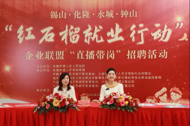江蘇深入實(shí)施“紅石榴”就業(yè)行動(dòng)。截至今年7月,全省13個(gè)設(shè)區(qū)市的410家企業(yè)累計(jì)面向民族地區(qū)各族群眾提供3.45萬個(gè)就業(yè)崗位。圖為江蘇省無錫市錫山區(qū)與貴州省六盤水市水城區(qū)、鐘山區(qū),青海省海東市化隆回族自治縣通過網(wǎng)絡(luò)平臺(tái)舉行“紅石榴就業(yè)行動(dòng)”合作簽約暨企業(yè)聯(lián)盟“直播帶崗”招聘活動(dòng)。江蘇省民族宗教事務(wù)委員會(huì)供圖