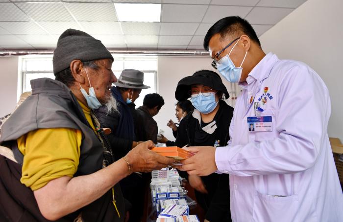 圖為2022年6月9日,時任拉薩市人民醫(yī)院院長、北京市第七批醫(yī)療人才“組團式”援藏醫(yī)療隊隊長孫樹學(xué)(前排右)在拉薩市當(dāng)雄縣格達(dá)鄉(xiāng)為群眾義診發(fā)藥 受訪者供圖