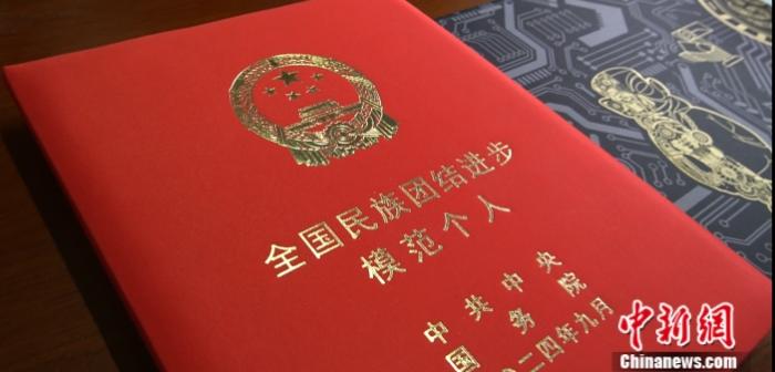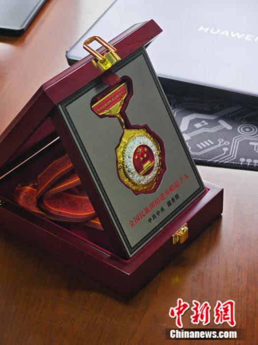 圖為孫樹學(xué)榮獲的全國民族團結(jié)進(jìn)步模范個人獎?wù)?中新網(wǎng) 薛凌橋 攝