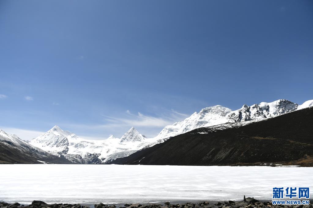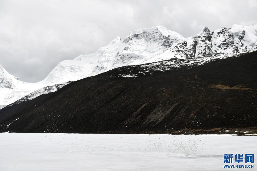 一陣強風(fēng)掠過薩普雪山腳下的冰湖時卷起湖面的薄冰(5月4日攝)。新華社記者 孫瑞博 攝
