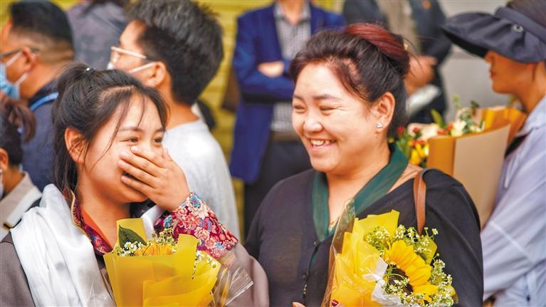 看到兒子從熙熙攘攘的人群中走出來,嘎瑪斯塔趕緊把花遞了上去,順便給了兒子尼瑪一個大大的擁抱?!鞍l(fā)揮得還行,應(yīng)該可以考進理想的大學(xué)?!蹦岈斬Q起大拇指為自己點了一個贊。