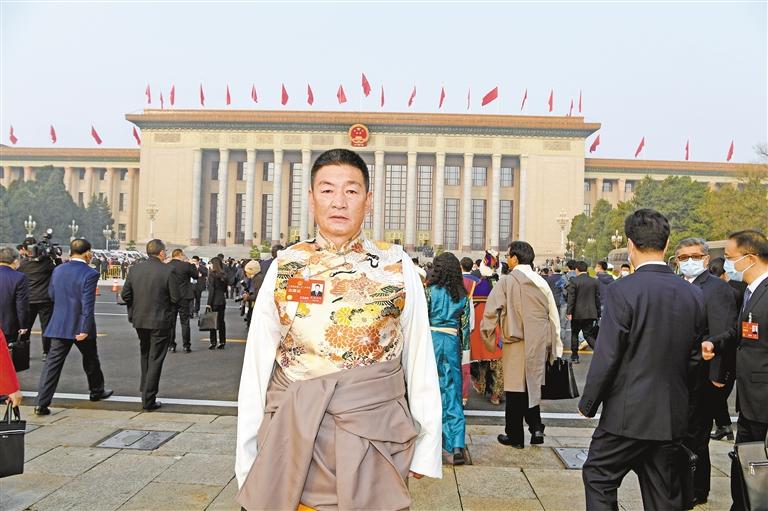 圖為全國(guó)人大代表扎西尼瑪在人民大會(huì)堂前拍照留念。 記者 李洲 攝
