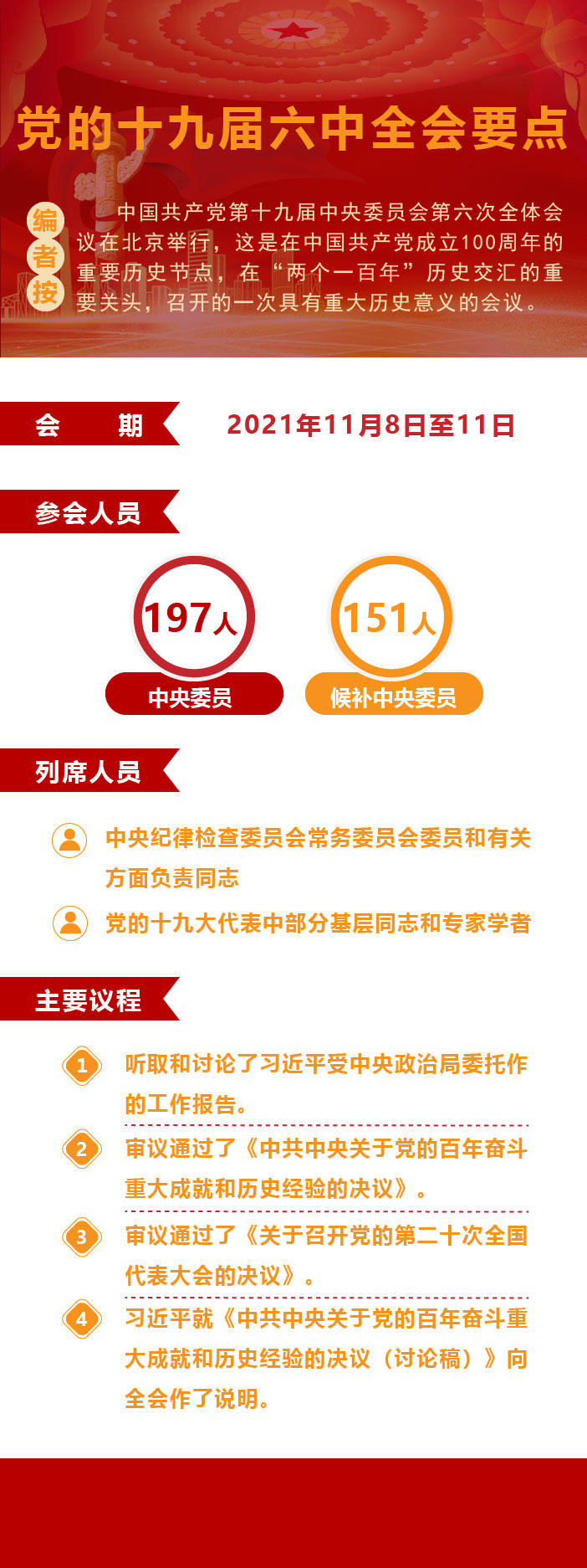 中國共產(chǎn)黨第十九屆中央委員會第六次全體會議,于2021年11月8日至11日在北京舉行。[詳細(xì)]