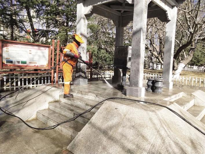 2月13日早上10點(diǎn),由西藏拉薩市城關(guān)區(qū)環(huán)衛(wèi)局局長(zhǎng)米瑪次仁牽頭,拉薩市城市建設(shè)投資經(jīng)營有限公司相關(guān)領(lǐng)導(dǎo)配合,調(diào)動(dòng)50名保潔人員、4臺(tái)高壓沖洗車和1輛8噸灑水車,對(duì)宗角祿康公園內(nèi)原市民活動(dòng)區(qū)域進(jìn)行擦、沖、洗作業(yè)。