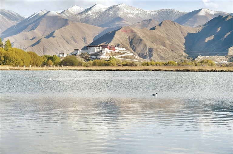 圖為拉魯濕地及遠處的布達拉宮。 新華社記者 覺 果攝
