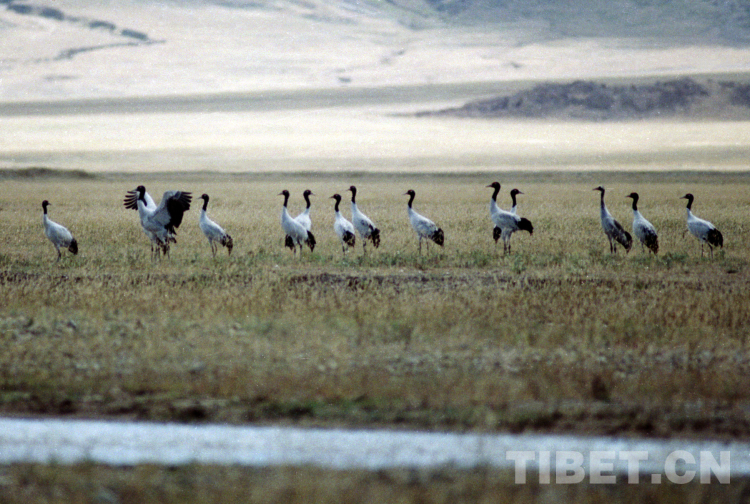 這首詩真實反映了藏北高原的面貌。這是在藏北高原申扎縣濕地棲息的國家一級保護(hù)動物黑頸鶴(唐召明2001年攝)[詳細(xì)]