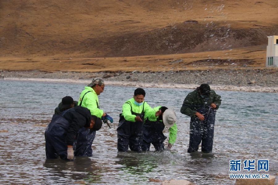三江源國家公園治多生態(tài)環(huán)保協(xié)會(huì)的志愿者在清理河道內(nèi)的垃圾(7月11日攝)。新華社發(fā)