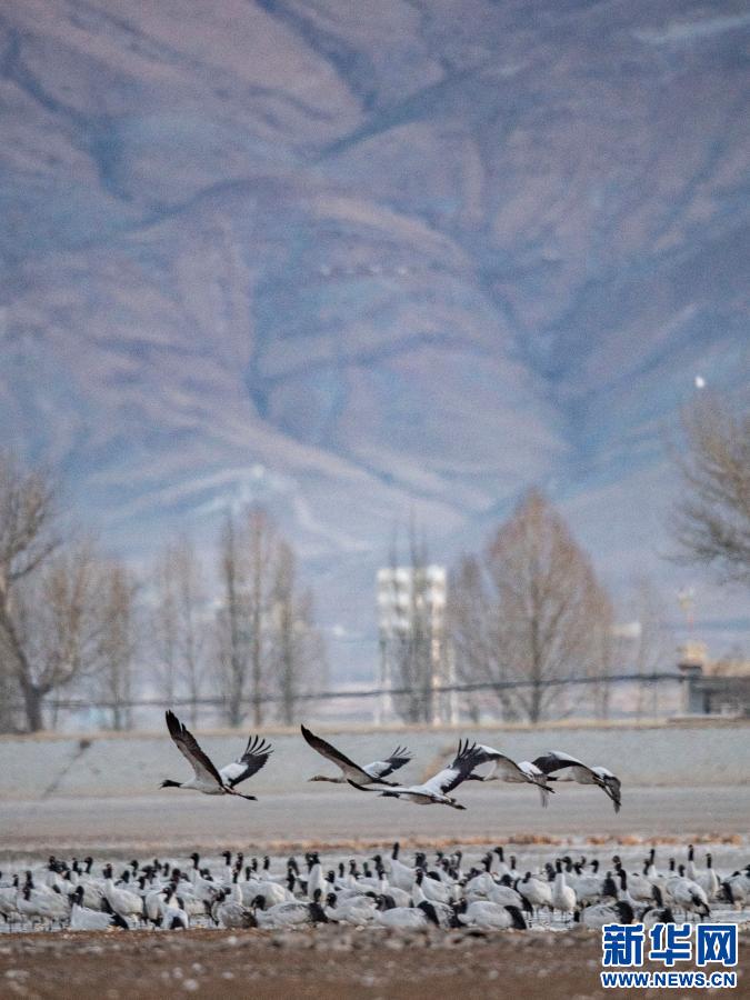 黑頸鶴在自然保護(hù)區(qū)里飛翔(2021年1月3日攝)。新華社記者 張汝鋒 攝