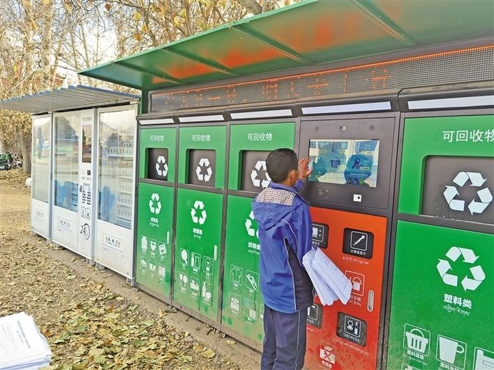 記者在林周縣城部分小區(qū)和學(xué)校內(nèi)看到,安裝的智能垃圾分類設(shè)備已全部投入使用,智能分類回收箱箱體上標(biāo)注著“紙張”“塑料”“金屬”等各類名稱。學(xué)生們只要在設(shè)備端口掃描校園班級卡上的二維碼,把廢紙、塑料瓶等垃圾依次分類放入“智能回收箱”,垃圾分類箱便會(huì)根據(jù)投放的垃圾自動(dòng)稱重計(jì)算積分,并在學(xué)生的校園班級卡賬戶上增加相應(yīng)的“垃圾兌換積分”,使用積分就可以在平臺(tái)兌換作業(yè)本、紙筆等學(xué)習(xí)用品。