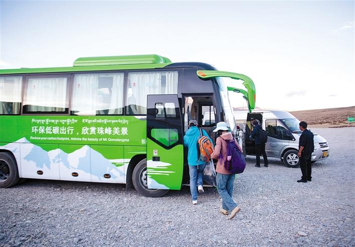 游客在珠穆朗瑪峰景區(qū)停車場轉(zhuǎn)乘環(huán)??蛙嚕?019年5月16日攝)。珠穆朗瑪峰景區(qū)內(nèi)自2019年5月開始試運營清潔能源環(huán)??蛙?,以進一步平衡珠峰地區(qū)旅游發(fā)展與環(huán)境保護需要。新華社記者 孫非 攝