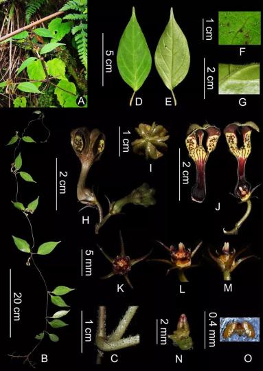 2021年7月中旬至8月初,由西雙版納植物園星耀武研究員率隊(duì)的聯(lián)合考察隊(duì),對(duì)西藏日喀則地區(qū)喜馬拉雅南坡的維管植物進(jìn)行了考察和標(biāo)本采集??疾烊藛T在吉隆縣薩勒鄉(xiāng)發(fā)現(xiàn)一種正處于盛花期的吊燈花屬未知植物。通過(guò)解剖拍照、文獻(xiàn)查閱及相似種的模式標(biāo)本核對(duì)后,最終確認(rèn)為一新種。根據(jù)其模式產(chǎn)地,將其命名為吉隆吊燈花(Ceropegia jilongensis)。