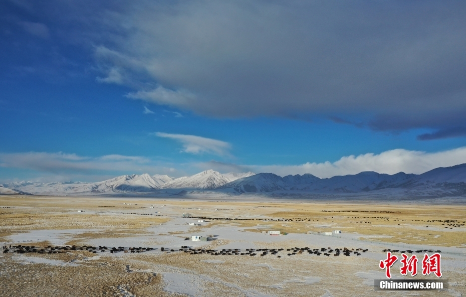 1月27日,當(dāng)雄縣龍仁鄉(xiāng)烏達(dá)村牧民趕著牛羊去牧場(chǎng)。當(dāng)雄縣位于西藏自治區(qū)拉薩市北部,距拉薩市區(qū)170公里?!爱?dāng)雄”,藏語意為“天選牧場(chǎng)”,平均海拔約4200米,草場(chǎng)廣闊,土地肥沃。(無人機(jī)照片) 中新社記者 貢嘎來松 攝